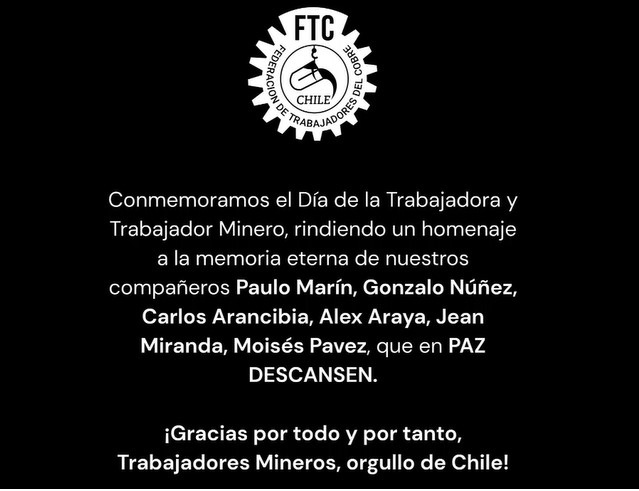 Con profundo pesar, nos unimos al dolor de las familias de nuestros seis compañeros fallecidos en la tragedia ocurrida al interior de la mina El Teniente, sin duda, de las más tristes y conmovedoras en la historia de Codelco. Desde la Federación de Trabajadores del Cobre las abrazamos; también a sus compañeros(as) de labores, a