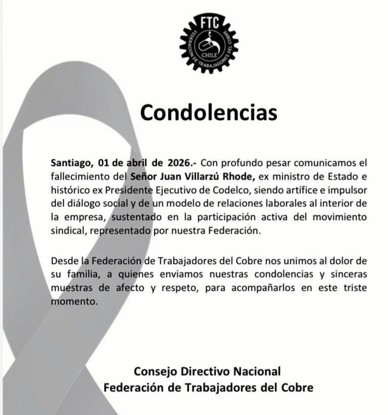 Con profundo pesar comunicamos el fallecimiento del Señor Juan Villarzú Rhode, ex ministro de Estado e histórico Presidente Ejecutivo de Codelco, siendo artífice e impulsor del diálogo social y de un modelo de relaciones laborales al interior de la empresa, sustentado en la participación activa del movimiento sindical, representado por nuestra Federación.