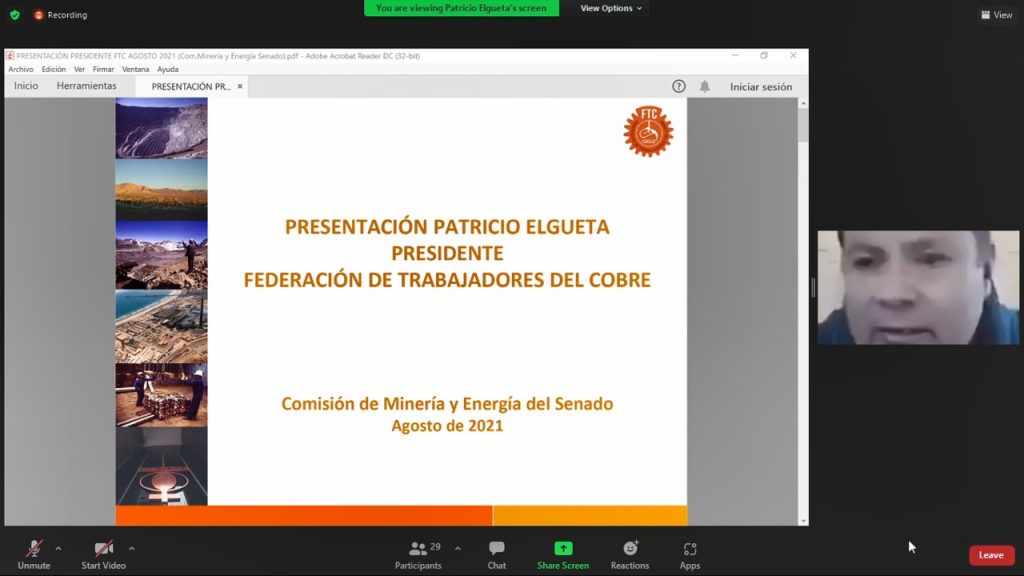 Este miércoles 25 de agosto, el presidente de la Federación de Trabajadores del Cobre, Patricio Elgueta, fue invitado por la Comisión de Minería y Energía del Senado, a exponer la visión de la organización frente al proyecto de Royalty a la minería por la explotación del cobre y litio, que se encuentra en plena discusión parlamentaria, luego de ser aprobado por la Cámara de Diputados.